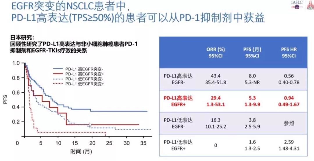 然而EGFR-TKI在“王炸”突变人群中的应用却是命途多舛。2018年吴一龙教授团队在JTO报道了PD-L1高表达对EGFR突变的NSCLC患者使用EGFR-TKI原发耐药的研究,研究发现,无论EGFR突变亚型如何,与PD-L1低表达或无表达相比,PD-L1高表达的NSCLC患者ORR显著降低,分别为35.7% vs 63.2%vs 67.3%(P=0.002),且PFS明显缩短,分别为3.8 vs 6.0 vs 9.5个月(P<0.001)。无独有偶,2019年发表在Lung Cancer上的一项台湾研究亦显示,在未经治的敏感EGFR突变肺腺癌患者中,较高水平的PD-L1表达与对EGFR-TKI治疗的原发性耐药率较高相关。原发性耐药组中,22.7%的患者表现出PD-L1高表达(TPS≥50%),而对照组中仅有1例患者。研究中有16例患者PD-L1≥50%,其中15例患者对EGFR-TKI治疗产生原发性耐药,剩余1例患者对EGFR-TKI治疗产生部分缓解,但PFS仅为4.4个月。