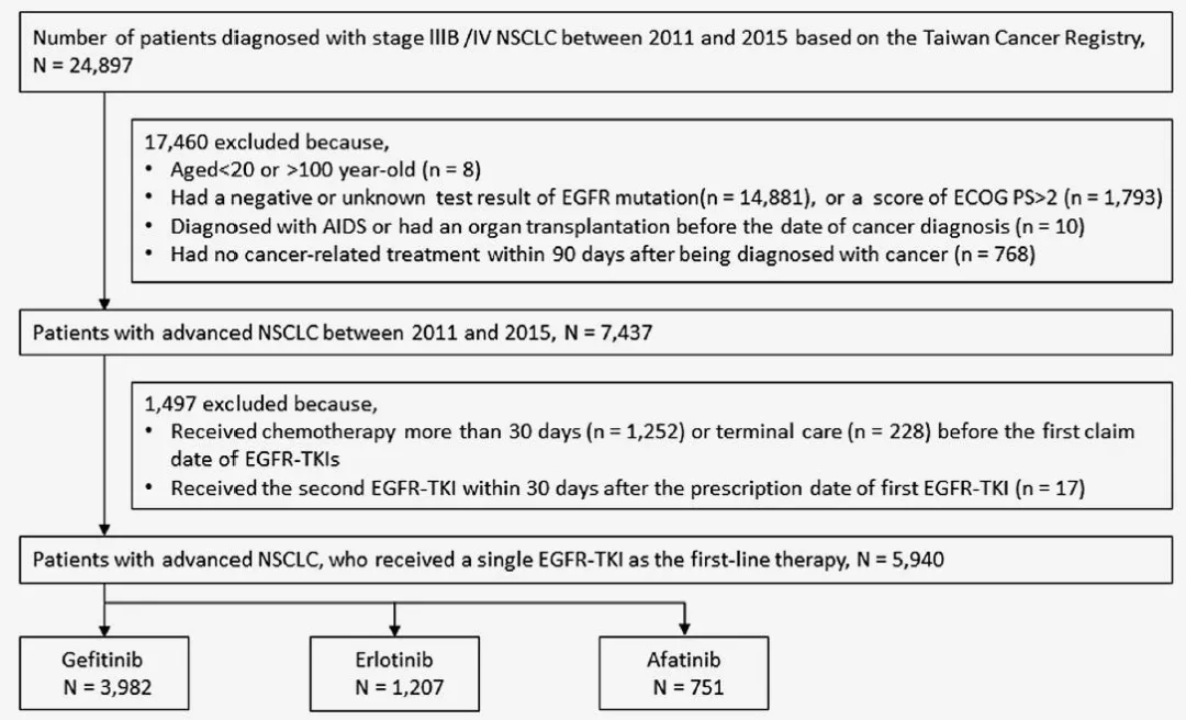 第一项研究发表于International Journal of Cancer杂志,是由我国台湾学者进行的,研究纳入2011年至2015年中国台湾癌症数据库中的所有IIIb/IV期非小细胞肺癌患者,排除以下患者:年龄≤20岁或>100岁;EGFR基因突变阴性或未知;PS评分>2分;有自身免疫系统缺陷或既往接受器官移植;非一线使用EGFR-TKI类药物。最终,研究共筛查24897例患者,7437例患者接一线接受EGFR-TKI类药物治疗,1497例患者因同时使用化疗、接受两种TKI类药物治疗或在TKI治疗之前,接受过姑息治疗等被排除入组,最终,共计5940例患者纳入疗效分析(图1)。