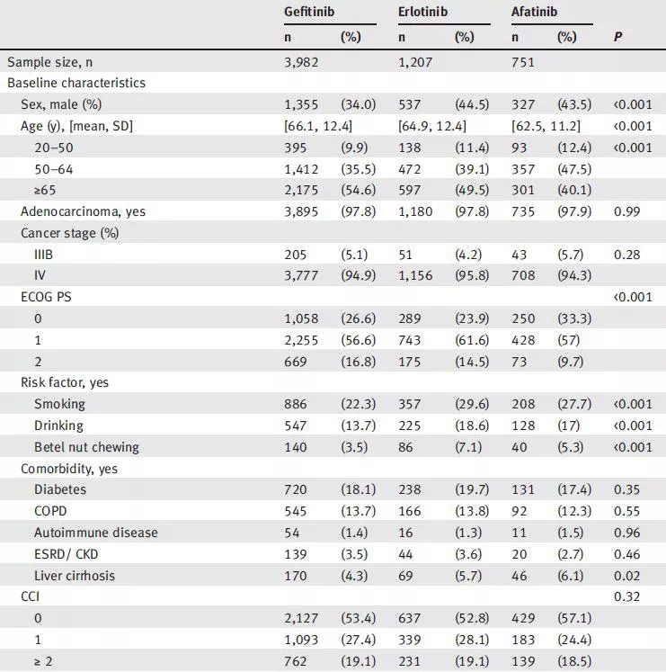分别有67%、23%和12.7%的患者接受吉非替尼、厄洛替尼和阿法替尼治疗。吉非替尼组的男性患者比例更低,占比为34%;阿法替尼组中位年龄62.5岁,更年轻,同时,阿法替尼组PS评分为2分的患者比例更低,占比为9.7%(图2)。