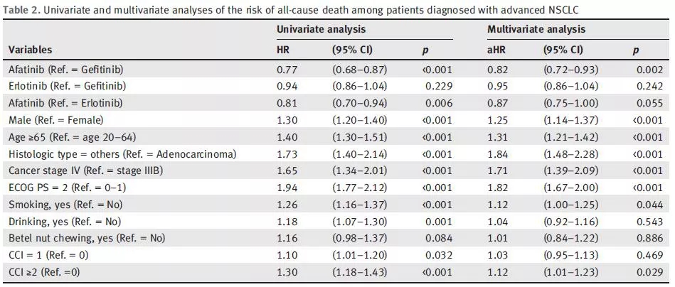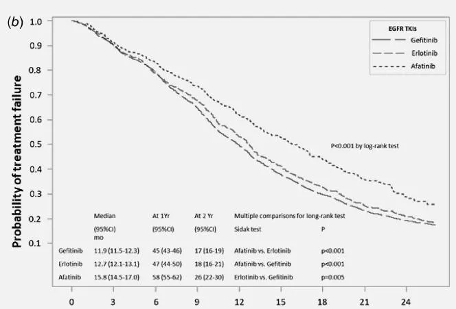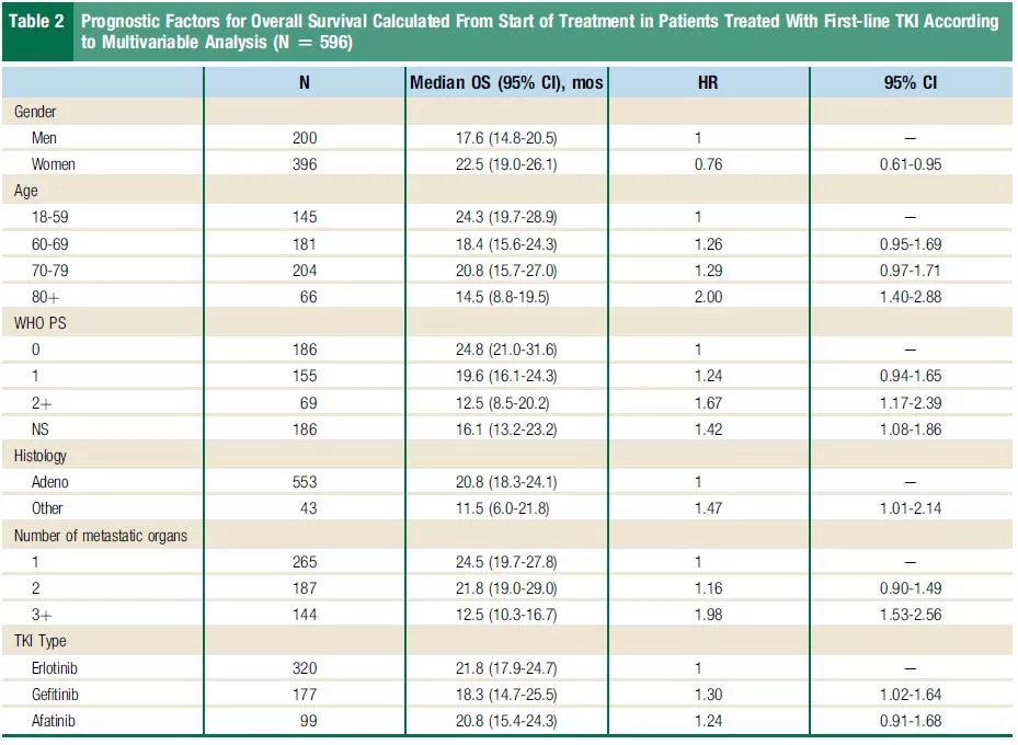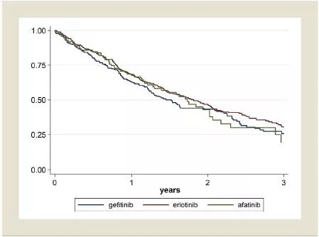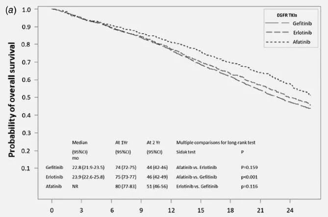吉非替尼组、厄洛替尼组和阿法替尼组的中位OS分别为22.8个月、23.9个月和未达到;1年的OS率分别为74%、75%和80%,两年OS率同样相似,多因素分析显示,阿法替尼较吉非替尼显示了更好的OS,但较厄洛替尼并没有显示出OS的优势。