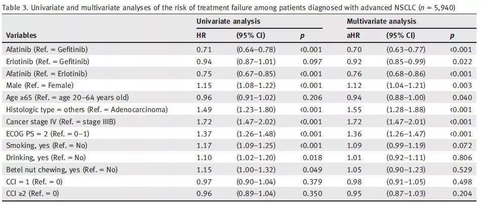 多因素分析同时发现,与吉非替尼组相比,阿法替尼组和厄洛替尼组治疗失败的风险更低,HR分别为0.70和0.92。若以厄洛替尼组作为参照,阿法替尼组治疗失败风险更低。同时男性、年龄在18~64岁、IV期及PS评分为2分的患者更可能治疗失败(图6)。