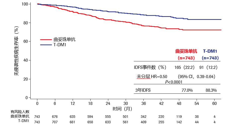 研究设计:研究入组患者为cT1-4/N0-3/M0、经新辅助治疗后仍然有残留病灶的HER2阳性乳腺癌患者,新辅助化疗要求至少6个周期(不少于9w的紫杉醇,允许使用蒽环和烷化剂,化疗均在术前完成),新辅助靶向治疗要求至少曲妥珠单抗9w(允许双靶)。患者术后12w随机分配至T-DM1组(3.6 mg/kg IV Q3W,共14周期)和曲妥珠单抗组(6 mg/kg IV Q3W,共14周期),主要终点为iDFS(预设的最终目标为3年iDFS率从曲妥珠单抗组的70.0%提高至T-DM1组的76.5%,HR 0.75)。研究于2013年4月3日至2015年12月31日共入组了1486例患者(曲妥珠单抗组和T-DM1各743例)。
