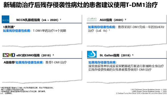指南推荐情况:KATHERINE研究结果无疑对HER2+早期乳腺癌标准治疗管理产生了很大的影响,T-DM1给患者带来了获益也改变了临床实践,同时也受到了全球多个指南推荐。