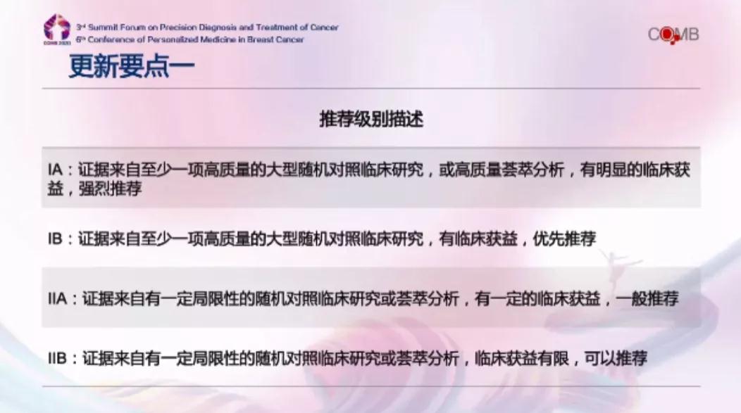在既往版本的基础上,2020年版本正式由“共识”升级为“指南”——《中国晚期乳腺癌规范诊疗指南(2020版)》。新版的中国ABC指南系由国家肿瘤质控中心乳腺癌专家委员会、中国抗癌协会乳腺癌专业委员会、中国抗癌协会肿瘤药物临床研究专业委员会组织专家组进行编写,并对不同建议新增了推荐级别的描述(下图),使指南更加科学、客观。