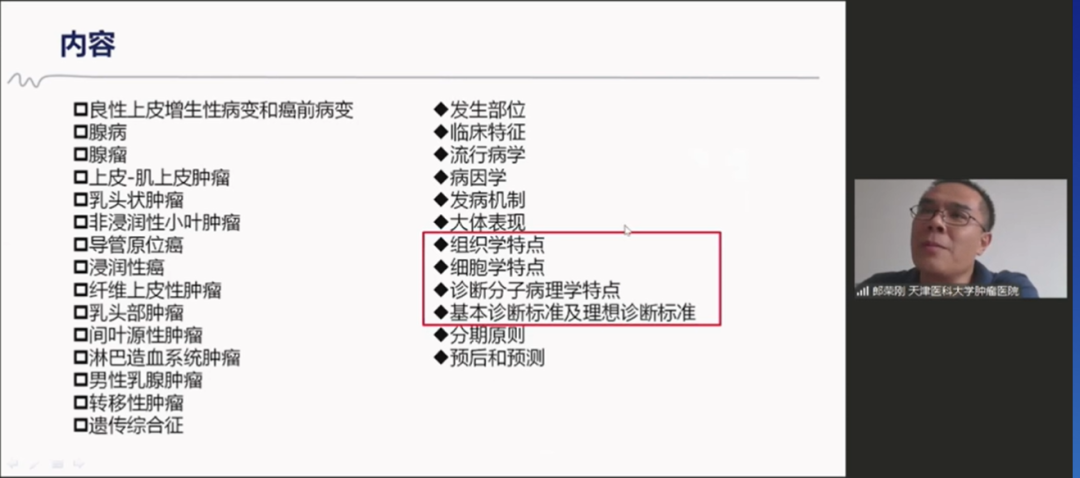 天津医科大学肿瘤医院郎荣刚教授分享了新版WHO乳腺癌分类与临床的系列内容。朗荣刚教授详细解读了世界卫生组织乳腺肿瘤分类第五版,内容主要涉及新版WHO乳腺肿瘤分类的总体情况,肿瘤微环境及间质反应,预后判断、疗效预测因素以及浸润性癌、非浸润性癌、上皮-肌上皮肿瘤和纤维上皮性肿瘤内容的更新。内容丰富,专业性强,引起与会的病理专家以及肿瘤内科专家的反响强烈与共鸣。