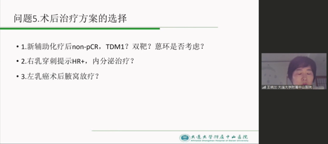 大连大学附属中山医院王晓兰教授带来了一例HER2阳性早期乳腺癌新辅助治疗的病例。天津医科大学肿瘤医院郎荣刚教授、大连医科大学附属第二医院李娜教授、天津医科大学肿瘤医院钱晓龙教授等专家共同探讨了实战中的难点痛点。