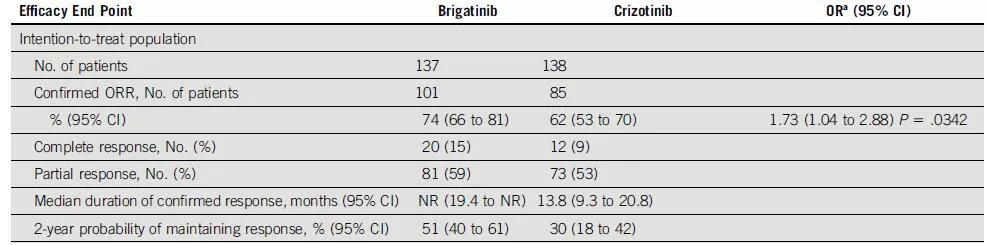 布格替尼组和克唑替尼组分别有18例和23例患者基线脑转移病灶为可评估病灶,其颅内ORR分别为78%和26%。独立评审委员会评估的两年PFS率分别为48%和15%。