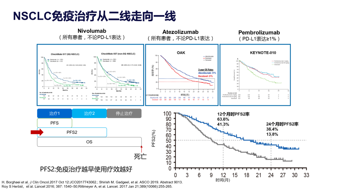 近年,肺癌的免疫治疗百花齐放,在NSCLC领域的应用一路披荆斩棘。刚登场时,纳武单抗、阿替利珠单抗和帕博利珠单抗先后在二线较多西他赛取得了生存的优势,顺利取得了二线治疗的适应症。随后研究者发现,尽早使用免疫治疗,可以更好的延长到疾病第二次进展的时间,为免疫治疗从二线走向一线铺就了道路。
