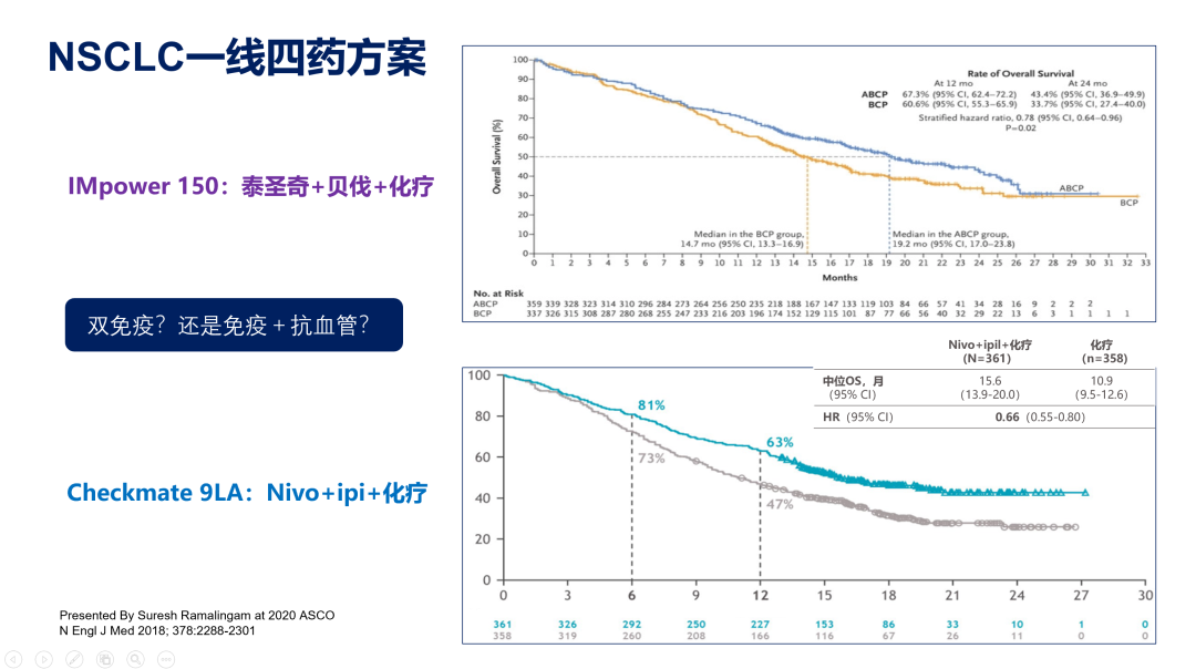 IMpower110研究和KEYNOTE042研究迅速证实了帕博利珠单抗和阿替利珠单抗单药一线用于PD-L1高表达患者可以取得明显获益。然而对于PD-L1低表达的人群,免疫治疗单药并不具备明显优势;同时,在治疗前期,免疫治疗获益并不明显,生存曲线与化疗有明显的重叠。不由令人深思,也许免疫治疗联合其他药物才是真正的出路?KEYNOTE189/407和IMpower130给出了答案,免疫治疗联合化疗一线治疗NSCLC,无论患者PD-L1表达状况如何,均能取得更好的生存获益,且在治疗早期就显示出较化疗更好的治疗效果,从而奠定了一线治疗的基础。在此基础上进一步衍生出IMpower150研究的免疫联合抗血管加化疗方案以及Checkmate9LA 伊匹木单抗联合纳武单抗的双免疫联合化疗方案更是以极其豪华的阵容带来了更好的生存期延长,但随之而来的是不良反应的增加,以及四药联合是否比三药优势更明显的质疑。面对质疑,免疫治疗联合抗血管生成药物隐隐约约开创了豁免化疗的时代,因此,大量的免疫联合治疗研究也在快速推进。