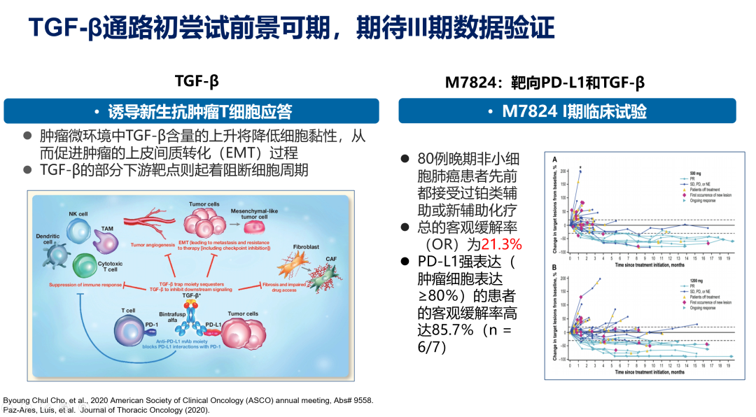 免疫治疗2.0时代,肿瘤微环境的研究更加深入,新的靶点也在不断发掘。CTLA-4抗体会诱导肿瘤PD-L1代偿性过表达,Checkmate227研究印证了此点,纳武单抗联合伊匹木单抗对于PD-L1>1%的患者较化疗或纳武单抗单药可有效改善患者OS,相应的需要关注其不良反应的发生。TGF-β可以诱导新生抗肿瘤T细胞的应答,靶向PD-L1和TGF-β的M7824对PD-L1≥80%的晚期NSCLC患者客观缓解可达85.7%。TIGIT抗体Tiragolumab可以阻断TIGIT与它的配体PVR结合,防止T细胞、NK细胞被抑制。2020年ASCO会上公布的CITYSCAPE研究证实对于PD-L1≥50%的NSCLC患者,一线使用Tiragolumab联合阿替利珠单抗较阿替利珠单抗提高患者ORR。