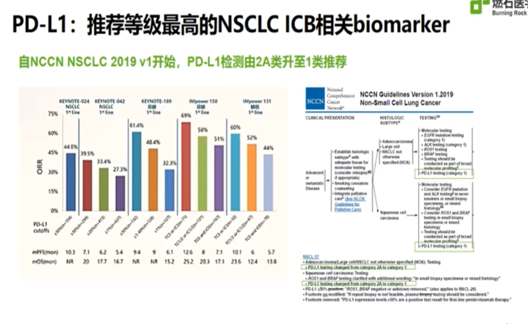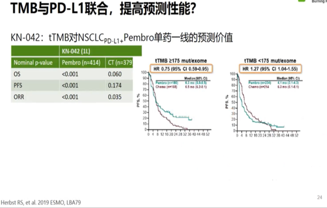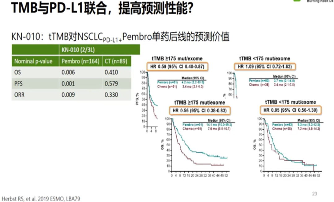 TMB作为单一生物标志物同样并不完美,既往研究显示免疫治疗生存最长的患者并非单纯TMB最高的患者,往往是TMB较高且PD-L1高表达的患者。更多研究也显示TMB和PD-L1是两个相对独立的预后因素,TMB能够提示肿瘤的免疫原性,但无法提示是否产生了抗肿瘤免疫应答。所以,联合TMB和PD-L1的检测,有可能及进一步优化对免疫治疗患者人群的选择,KEYNOTE010与KEYNOTE042 研究也证实了在PD-L1阳性患者引入TMB分层后,对免疫治疗具有更好预测价值。