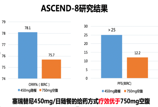 ASCEND-8研究发现塞瑞替尼450mg随餐减量增效且更安全,塞瑞替尼也以此剂量(450mg随餐)在中国上市。