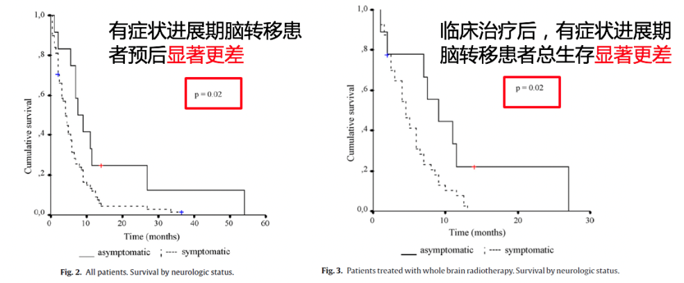 既往对476例患者的长期随访结果显示,有症状脑转移中位OS仅4个月,疾病控制率仅40%,较无症状、稳定期脑转移预后更差(OS 7.5个月,DCR 80%)。比较生存曲线,有症状、进展期脑转移患者,或接受治疗后有症状、进展的脑转移患者,总体预后都更差。