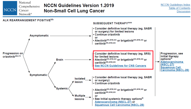 目前NCCN指南中,针对克唑替尼治疗进展后出现有症状的脑转移,删除了原来“继续克唑替尼治疗”的治疗选项,改为换用二代ALK抑制剂