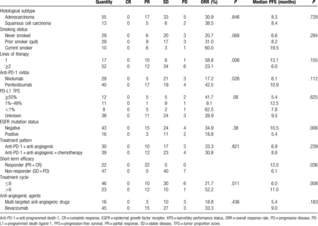 焦顺昌教授团队开展了一项PD-1联合抗血管的真实世界研究(图5),这是一项纳入69 例 NSCLC 患者的回顾性小样本研究,在抗血管治疗药物选择上,65.2%只选择贝伐,14.5%只选择了阿帕替尼,7.2%只选择了安罗替尼,5.8%选择恩度,5.8%选择贝伐和安罗替尼,1.5%选择安罗替尼和阿帕替尼,ORR 为 31.9%,中位 PFS 为 8.37个月,与既往RCT研究较为类似。在使用贝伐珠单抗和TKI比较上,似乎贝伐珠单抗联合免疫更有效(中位PFS 9.0 VS 5.4个月)。