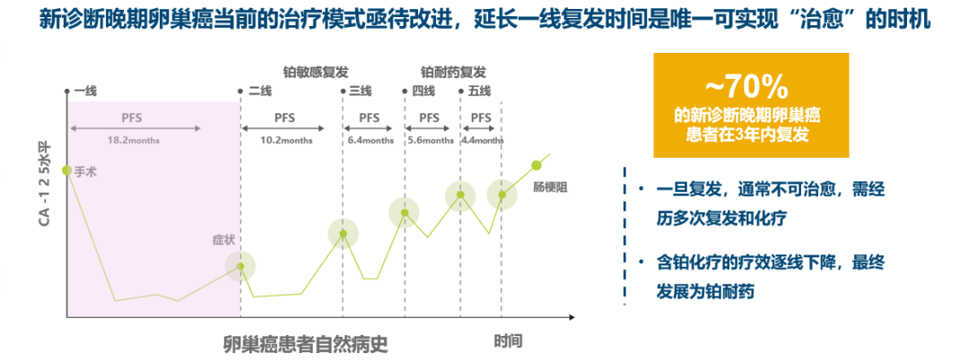 目前卵巢癌的治疗模式以手术(分期或细胞减灭)及化疗为主。卵巢癌患者往往经历手术-化疗-复发-化疗-再复发-再化疗的循环,期间因化疗敏感性逐渐降低,复发周期不断缩短。因此尽量延长患者一线化疗后的复发时间,成为卵巢癌唯一的“治愈”时机,PARPi抑制剂的维持治疗强调通过低毒、服用方便、疗效敏感的固定疗程药物治疗,正是满足了这一卵巢癌患者的巨大治疗需求。这次SOLO1提供的最终PFS数据表明,奥拉帕利无疑是引领卵巢癌治疗进入“治愈时代”的重要治疗选择。