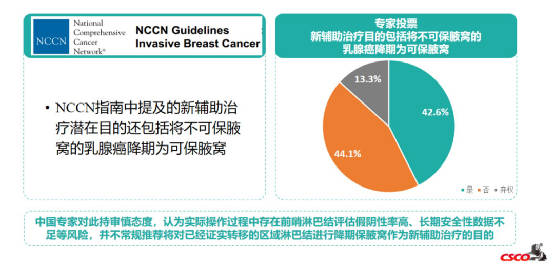 新辅助治疗目的争议:NCCN指南中提及的新辅助治疗潜在目的还包括将不可保腋窝的乳腺癌降期为可保腋窝,但中国专家对此持审慎态度,认为实际操作过程中,存在前哨淋巴结评估假阴性率高、长期安全性数据不足等风险,并不常规推荐将已经证实转移的区域淋巴结进行降期保腋窝作为新辅助治疗的目的。