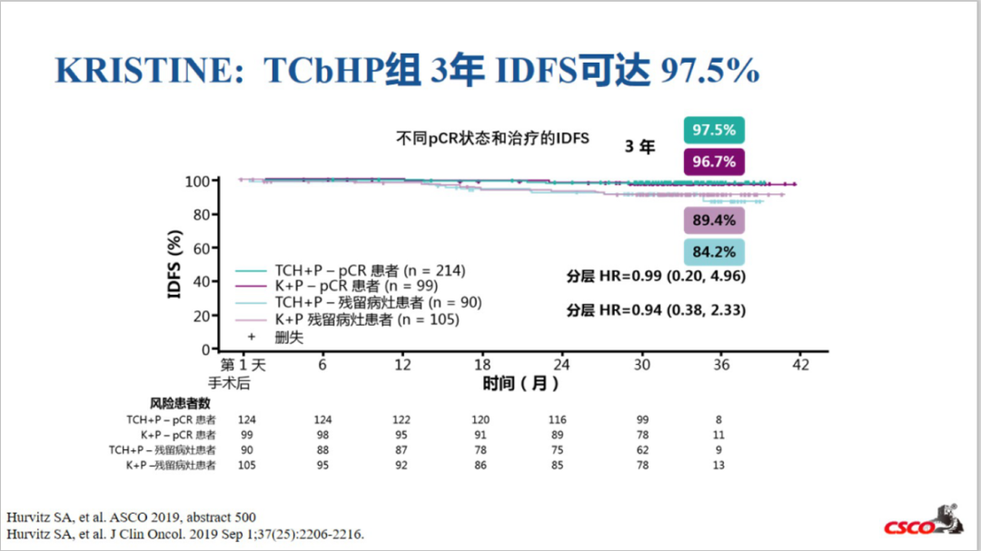 KRISTINE研究比较了曲妥珠单抗+帕妥珠单抗+化疗(TCH+P)与T-DM1+P用于新辅助治疗的疗效及安全性,结果显示,新辅助TCH+P与T-DM1+P相比,有更好的pCR率(56% vs 44%,P=0.01551)。进一步随访发现,对于接受TCH+P达到pCR的患者,其3年IDFS可达97.5%。