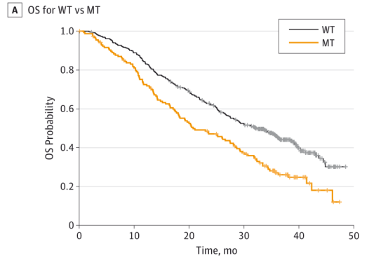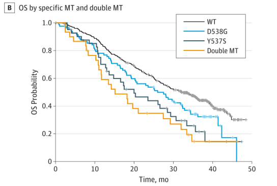 图2A:D538G和/或Y537S突变患者和ESR1(野生型[WT])无突变患者的OS结果图2B:WT、仅D538G突变、仅Y537S突变和D538G和Y537S双突变(双MT)患者的OS结果