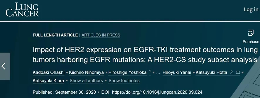 EGFR-TKI是携带EGFR敏感突变患者的一线标准治疗,但患者的疗效却存在巨大差异,共突变是潜在机制之一。既往研究发现,HER-2突变是导致EGFR-TKI继发性耐药的机制,但该突变对EGFR-TKI一线治疗疗效的影响尚不明确。9月30日,LungCancer杂志发表了来自日本学者对前瞻性HER2-CS研究事后分析的结果,该结果探索了HER-2蛋白过表达对EGFR-TKI疗效的影响。