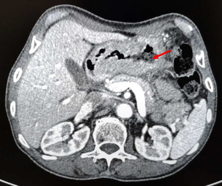 图1-2 2018-4-4 箭头为胃部肿瘤,胃壁增厚明显