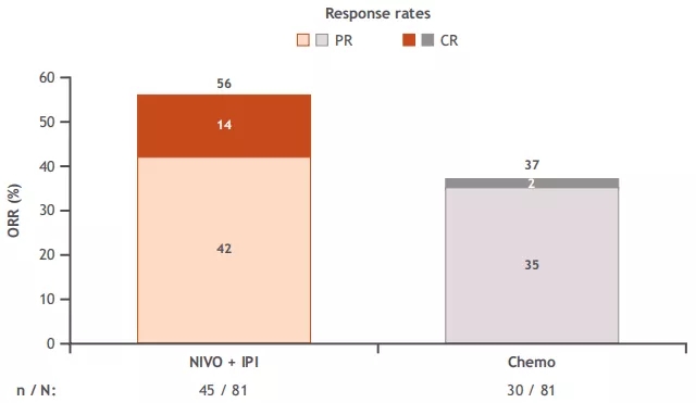 而此次公布的亚裔患者数据显示,亚洲亚组共计245例患者,分别有121例、124例随机至Nivo+ipi组和化疗组。数据显示:
