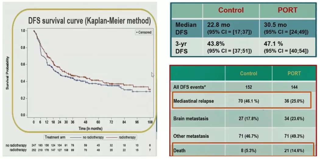 Lung ART入组了501名已接受完整手术切除和淋巴结探查的N2 NSCLC患者,这些患者大多数接受过化疗(术后77%,术前18%)。患者随机分组:252例分至PORT组接受适形放疗(54 Gy/27-30f), 249名分至对照组(无PORT)。经过4.8年随访,PORT组和对照组的3年DFS率为47.1%和43.8%,3年DFS率改善3.3%,与这项试验要求的DFS改善12%的阳性结果差距甚大。PORT组和对照组的中位DFS为30.5个月和22.8个月,PORT使中位DFS提高了约8个月。纵膈复发率降低了20%以上,从46.1%下降到25%。3年OS率分别为66.5%和68.5%。尽管PORT没有显著提高总体生存率,但在改善中位无病生存率和改善胸部疾病控制方面确实有一些好处。Lung ART还发现两组的转移性复发率没有差异。