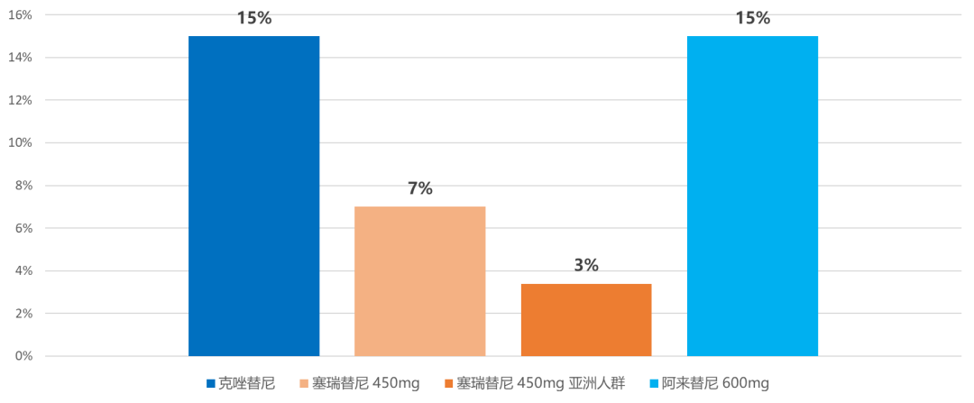 不同ALK-TKI 因AE造成的治疗终止情况也各有不同。塞瑞替尼450 mg/d随餐组中由于AEs导致的停药率最低,仅7%,亚洲人群的停药率更低,仅3.4%。而2020更新的ALEX研究显示,阿来替尼和克唑替尼由于AEs导致的停药率均为15%。