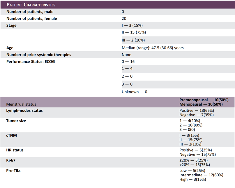 基线特征:2019年2月19日至2019年11月20日期间,研究共纳入20例患者,有19例患者完成了8个周期P+EC-TH的新辅助治疗。在入组患者中,Ⅱ~Ⅲ期患者占85%(17例),淋巴结阳性患者占65%(13例),Ki-67>20%的患者占75%(15例),治疗前TILs中高水平患者占75%(15例)。