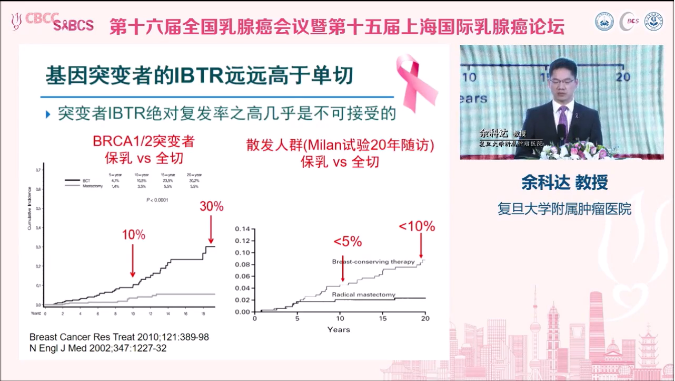 余科达教授:其实在我临床实际工作中并不苛求对所有gBRCA1/2突变的乳腺癌患者均不进行保乳手术,如果患者有强烈的保乳需求并无其他危险因素,我可能尝试进行保乳手术。从科学角度去讲,NCCN指南一直都把乳腺癌基因易感性作为保乳手术的相对禁忌症,gBRCA1/2突变的乳腺癌患者显然不是非常良好的保乳手术candidate(候选人)。我将从以下三方面去论证。