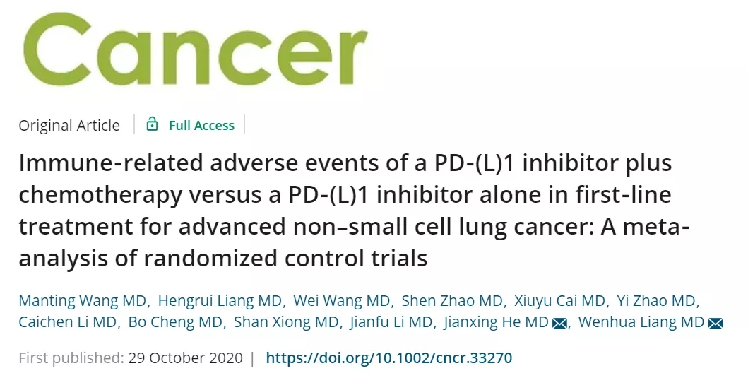 广州医科大学附属第一医院何建行/梁文华教授团队近日在国际期刊Cancer发表了一项单臂及间接对比荟萃分析,对比了在免疫检查点抑制剂基础上,联合化疗对irAE的影响。研究的第一作者为王曼婷、梁恒瑞和王炜。