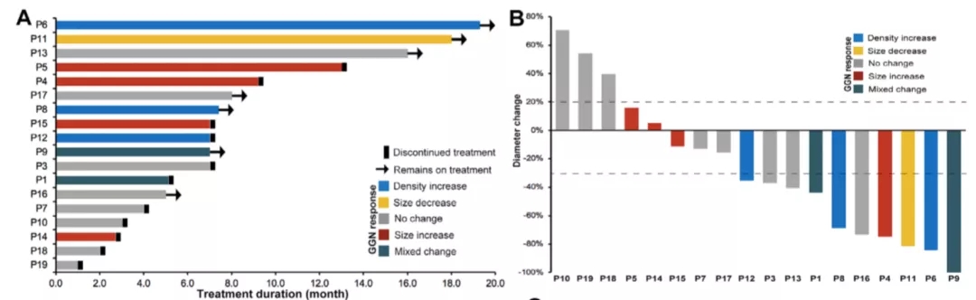 本研究系统性回顾性分析了上海市肺科医院208例接受了PD-1/PD-L1抗体为基础的免疫治疗的晚期肺癌患者影像学资料,发现其中18例晚期肺癌患者同时合并肺部磨玻璃影,共计37个磨玻璃(通过严格的影像学定义,保证磨玻璃结节的恶性可能)。其中,接受免疫治疗单药6例,免疫联合阿帕替尼3例,免疫联合化疗9例。8例患者作为一线治疗,6例二线治疗,4例为三线及以上治疗。晚期肺癌原发灶对免疫治疗的有效率为55.6%,而相应的磨玻璃变化与原发灶变化不一致(图1),根据影像学特征,主要有4种变化形式:体积增大、体积缩小、实性成分增加、无变化(图2)。