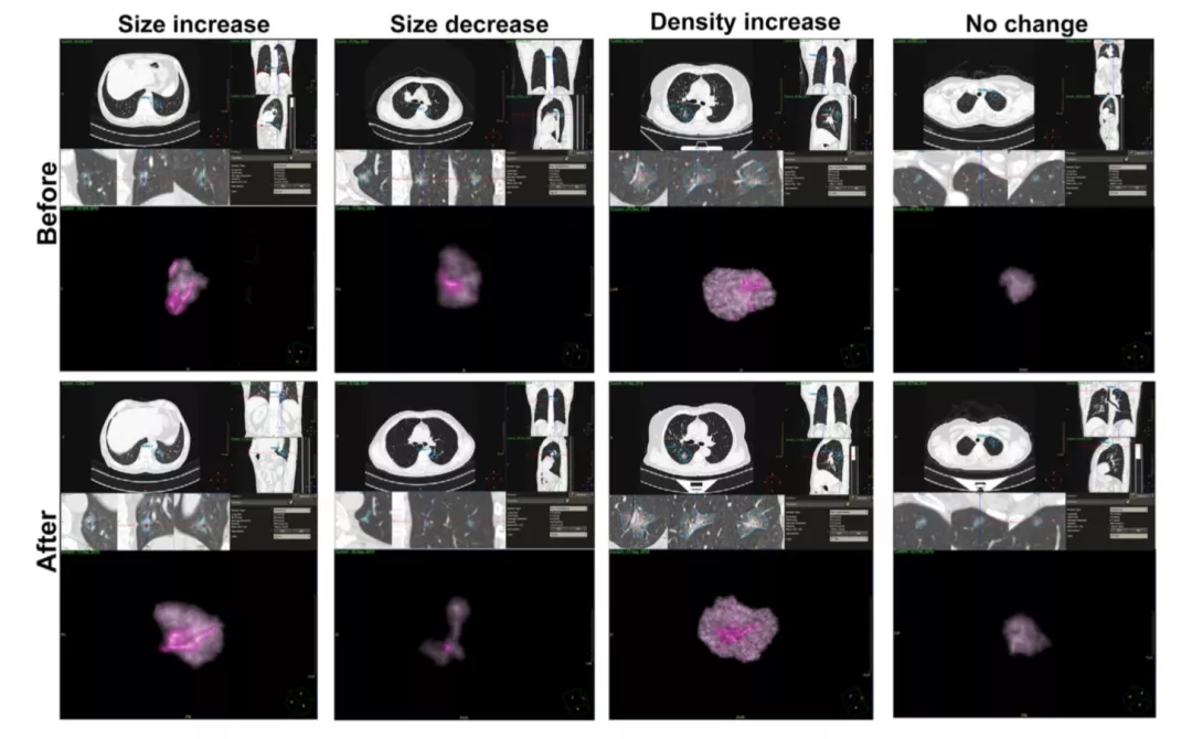 图2. 合并肺部磨玻璃影的4种变化形式:体积增大、体积缩小、实性成分增加、无变化