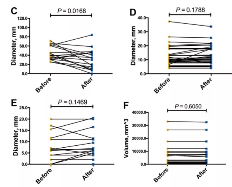 接受免疫治疗后,原发灶最长径显著减小(P=0.0168),同时磨玻璃的最长径有所增大(12.2 vs 12.8 mm,P=0.1788)、实性成分增加(3.0 vs 3.5 mm, P=0.1469)、磨玻璃体积增加(4160.2 vs 4185.5 mm3, P=0.6050),可能因为样本量的原因,差异未达到统计学差异(图3D、E、F)。