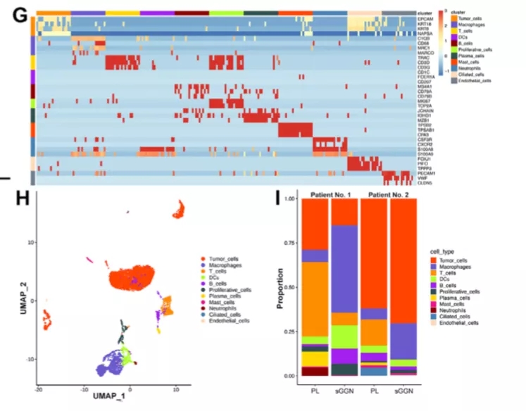 图4. 病理证实的磨玻璃样早期肺癌和晚期肺癌原发灶单细胞测序结果