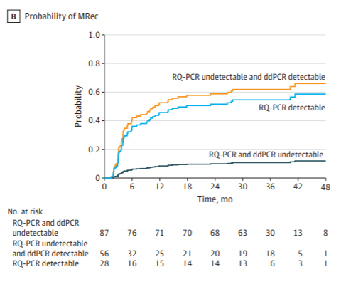 该研究表明,CML患者TKI停药是安全的,60.8%的患者仍在TFR中。停止TKIs与改善PROs相关。这些发现将有助于患者和医生对停药做出决策。停药时RQ-PCR或ddPCR检测到BCR-ABL1与MRec的高风险相关;这一发现的临床应用需在其他研究中得到证实。
