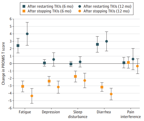 在PROs方面,在12个月时TFR的112名患者中,90名(80.4%)患者的疲劳症状获得有临床意义的改善,39名(34.8%)患者的抑郁症获得有临床意义的改善,98名(87.5%)患者的腹泻获得有临床意义的改善,24名(21.4%)患者的睡眠障碍获得有临床意义的改善,5名(4.5%)患者的疼痛获得有临床意义的改善。重新开始TKI治疗将导致PROs恶化。
