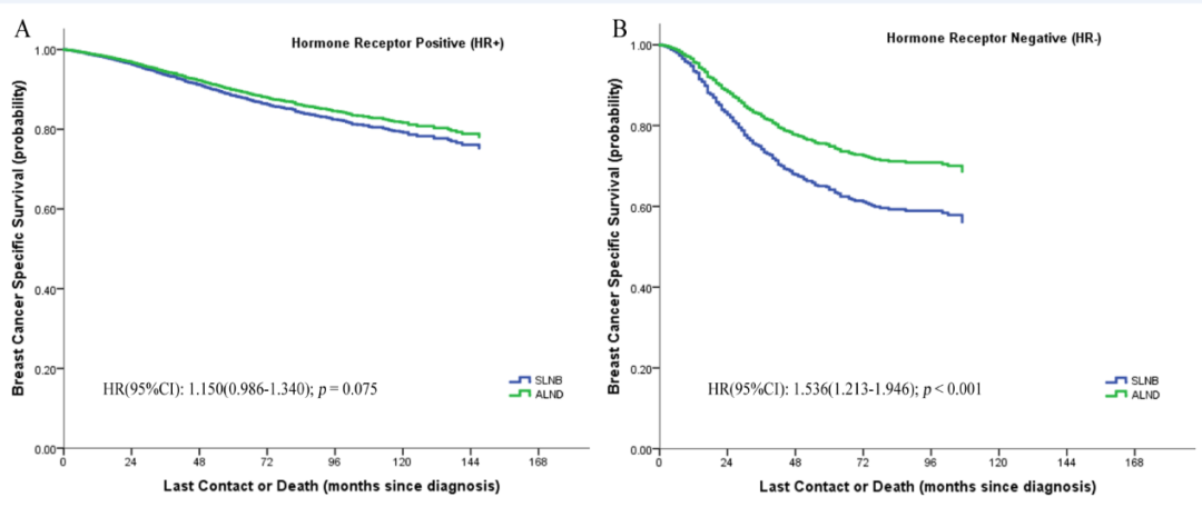 在符合入组条件的75,950名患者中,未进行腋窝淋巴结评估的患者的预后显著较差。SLNB和ALND组的患者的BCSS无统计学差异[校正风险比(HR):0.991,95%置信区间(CI):0.925~1.062;对已知协变量进行调整后,P=0.800]。根据PSM后的亚组分析,除了N分期为N2或以上,在不同的临床、病理、治疗手段的亚组中,ALND与SLNB相比均未显示出明显的BCSS获益。此外,对N1期患者进行匹配后,在激素受体阴性(HR-)人群中,ALND的BCSS表现较SLNB组稍有优势(HR=1.536;95%CI:1.213~1.946;P<0.001),而在激素受体阳性(HR+)人群中,我们观察到SLNB组并未产生生存的劣势(HR=1.150;95%CI:0.986~1.340;P=0.075)。