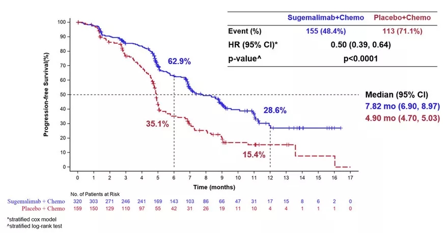 GEMSTONE-302纳入未接受过转移性疾病全身治疗的晚期NSCLC患者,按组织学(鳞状与非鳞状NSCLC)、PD-L1表达水平(≥1%;<1%)和ECOG表现状态(0/1)进行分层。截至2020年6月8日,研究共入组479例患者,2:1随机分组。两组患者均接受最多4个周期的含铂化疗,随后接受最多2年的CS1001或安慰剂的维持治疗,培美曲塞也用于非鳞状非小细胞肺癌的维持治疗。主要终点为基于RECIST v1.1标准研究者评估的PFS;次要终点包括总生存期(OS)、盲态独立中心审查委员会(BICR)评估的PFS和安全性等。