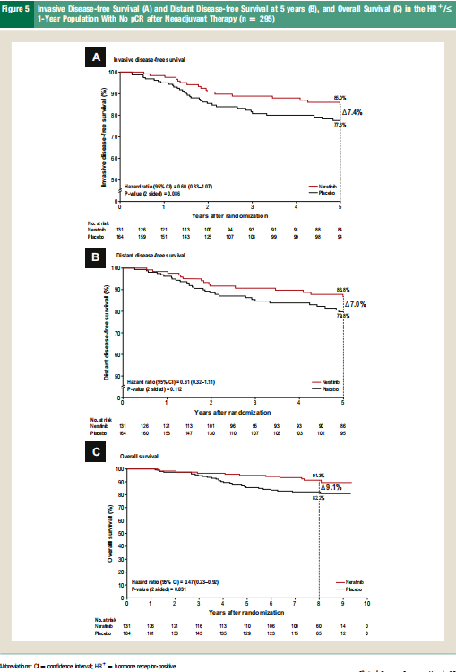 HR+/>1年人群中,奈拉替尼组iDFS率为93.0%(95%CI:86.5%~96.5%),安慰剂组为91.7%(95%CI:85.4%~95.4%),奈拉替尼组绝对获益为1.3%(HR=0.74;95%CI:0.29~1.84)(见Supplemental Figure 2B)。