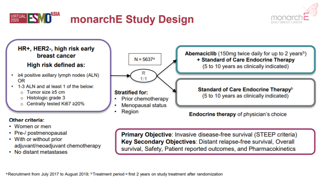 背景:超过90%的乳腺癌患者被诊断为早期乳腺癌(EBC),虽然这其中许多HR+患者在标准治疗下不会复发或有远处转移,但其中仍有经临床或病理学评估为高风险的患者,存在复发转移风险,临床亟需新的治疗方案来预防这些患者的早期复发和远处转移。Abemaciclib是一种口服,连续给药的CDK4/6抑制剂,被批准用于HR+,HER2-晚期乳腺癌(ABC)。abemaciclib在ABC中的有效性和安全性支持了辅助治疗的III期评价。