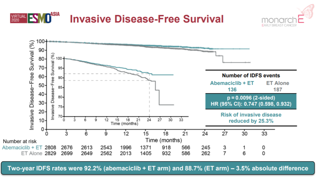 结论:Abemaciclib是唯一被证实与内分泌治疗联合后,在复发高风险HR+,HER2-早期乳腺癌患者中能够获得具有显著统计学意义的无浸润性疾病生存期(IDFS)改善的CDK4/6抑制剂