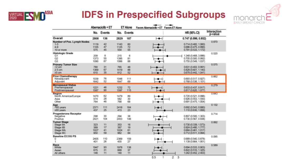 结果:研究从38个国家的600多个中心随机入组了5637例HR+/HER2-高危早期乳腺癌患者,按1:1比例分别接受Abemaciclib+内分泌治疗或单纯内分泌治疗。在两组的意向治疗人群中观察到323例IDFS事件。Abemaciclib加内分泌治疗的IDFS优于单独的内分泌治疗(HR:0.747,95%CI:0.598~0.932,P=0.0096),较单独使用标准辅助ET显著降低了25.3%的IDFS风险。两年IDFS率分别为92.2%和88.7%。DRFS也有类似的改善(HR:0.717,95%CI:0.559~0.920,P=0.0085),两年DRFS率分别为93.6%和90.3%。在所有预设的亚组中,患者均一致显示出具有统计学意义的获益。最常见的不良反应是腹泻、中性粒细胞减少和疲劳,对照组最常见的不良反应是关节痛、潮红和疲劳。安全数据与abemaciclib的已知安全曲线一致。