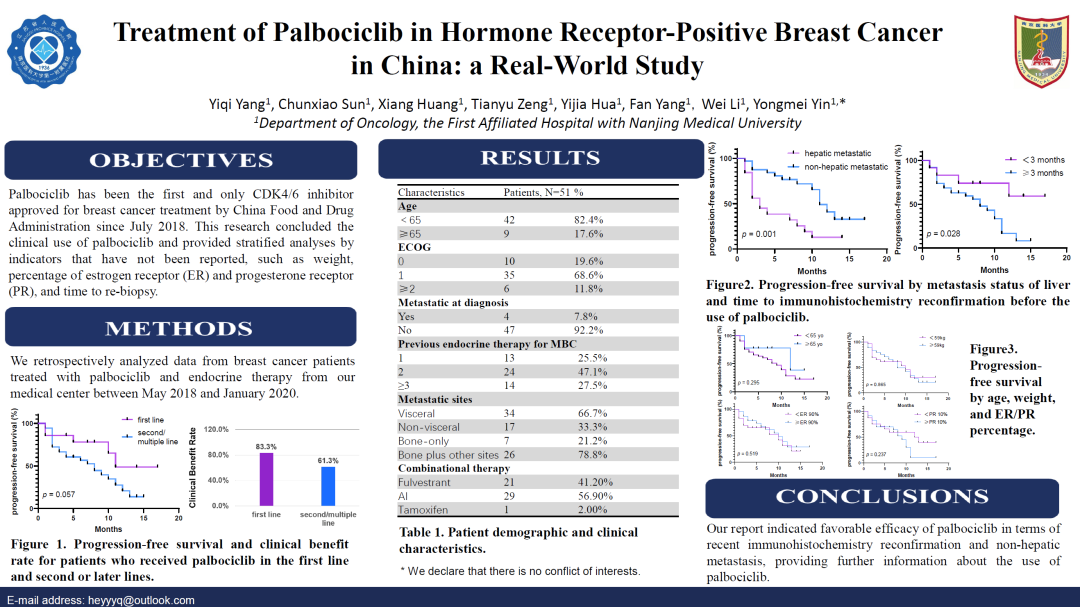 我们回顾性地分析了2018年5月至2020年1月接受哌柏西利联合内分泌治疗的激素受体阳性复发转移性乳腺癌患者的临床资料。51名接受哌柏西利的患者中,14名患者为一线治疗,37名患者为二线或后线治疗。总客观缓解率为10.6%(5/47,95%CI:3.5%~23.1%),总临床获益率为67.4% (29/43,95% CI:51.5%~80.9%)。中位无进展生存时间为10个月(95%CI:7~13)。本研究发现更好的临床结局与免疫组化(再)确认距离用药时间较近(<3months vs ≥3months,P=0.028;<6months vs ≥6months,P=0.046)、非肝转移(P=0.001)相关,但与ER/PR百分比、Ki-67指数、体重,及一/二线患者的前序化疗用药无关。