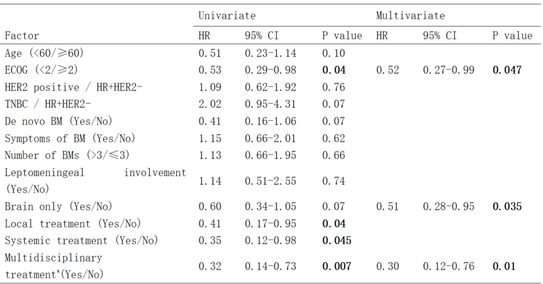 表4.单因素和多因素生存分析提示初诊晚期乳腺癌伴脑转移患者的预后因素