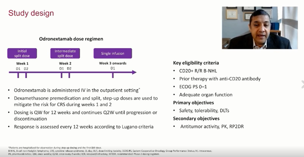 采用递增剂量方案给予Odronextamab (REGN1979),第1周给予初始剂量,第2周给予中剂量,此后,每周固定剂量,直至第12周,然后维持每2周给药一次的剂量。预防性使用地塞米松以降低细胞因子释放综合征(CRS)的风险。