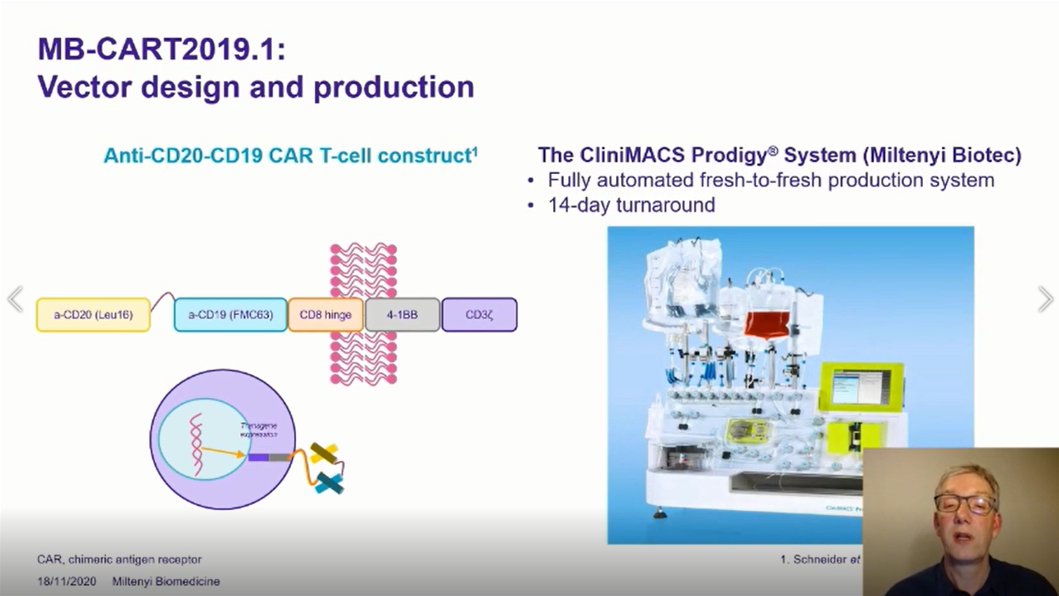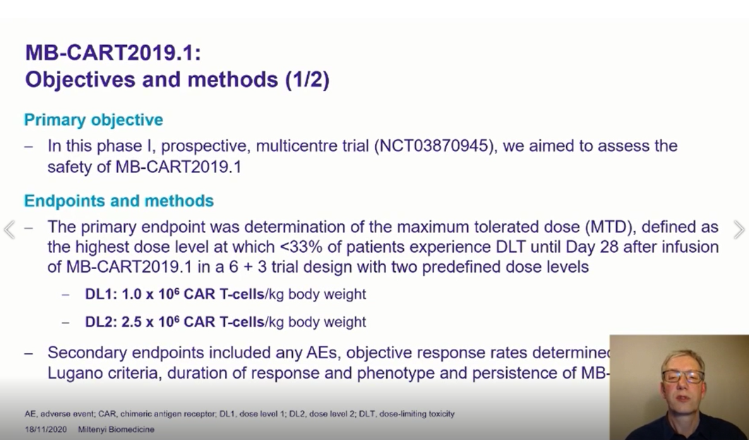 研究为6 + 3试验设计,主要有两个预定评估剂量水平。主要评估其药效学,包括CAR-T细胞的最大浓度(Cmax),峰扩展时间(tmax),AUC(d0至d28)和持久性。研究计划在白细胞分离后14天输注(第0天)新鲜的MB-CART2019.1。从研究前第-5天到第-3天进行氟达拉滨/环磷酰胺淋巴结清髓化疗。
