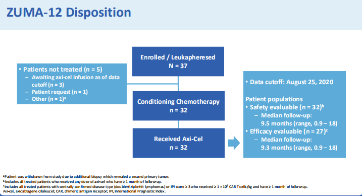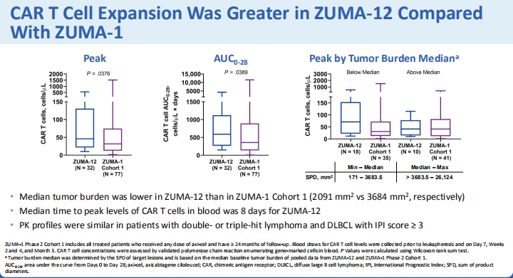 根据ZUMA-1结果来看,针对≥2线以上系统治疗后 R / R LBCL成人治疗效果显著。因此研究人员进行了ZUMA-12研究,旨在探究高风险LBCL的患者一线接受抗CD19嵌合抗原受体(CAR)T细胞疗法Axicel的疗效、安全性和药代动力学(PK)结果。