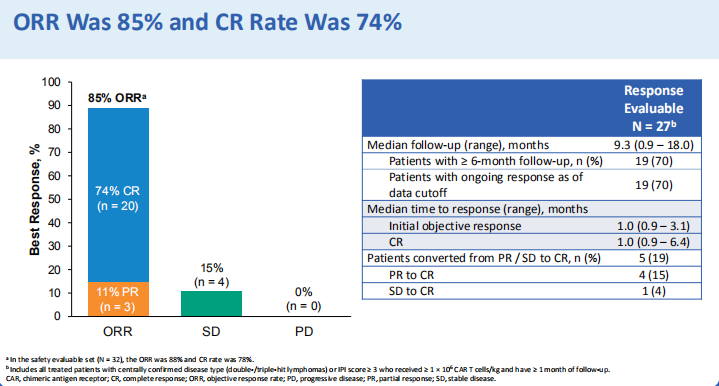 ZUMA-12是第一个将CAR T细胞疗法作为高危LBCL的一线疗法的研究,且Axicel治疗该类患者具有明显的临床获益,ORR和CR率高,安全性可控。