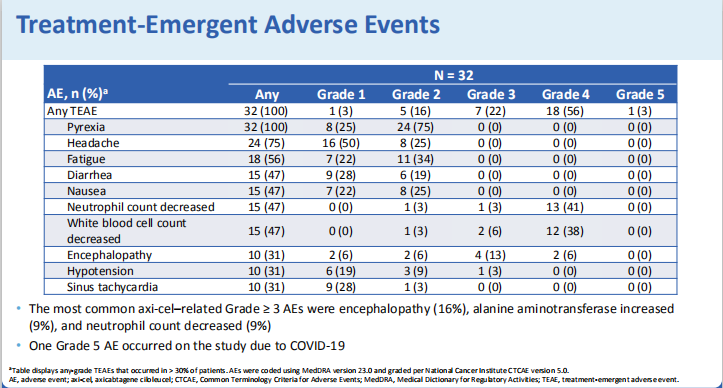 ②安全性方面:15例可进行安全性评估的患者中,有80%经历了3级以上AE。最常见的≥3级不良事件(≥25%)是白细胞计数下降(40%),贫血(27%)和脑病(27%)。≥3级细胞因子释放综合征(CRS)和神经系统事件(NEs)分别发生在20%和27%的患者中。任何级别的所有CRS和10/11 NE均得到解决,没有发生5级不良事件。